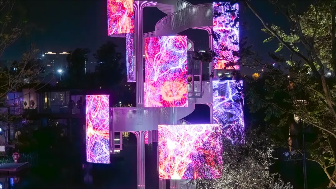 利亞德LED異形顯示屏的應(yīng)用,助力打破傳統(tǒng)美術(shù)館單一功能與形態(tài)。利亞德LED異形顯示屏不僅實(shí)現(xiàn)了與生命塔建筑外觀的無(wú)縫融合,還通過(guò)顯示屏的動(dòng)態(tài)旋轉(zhuǎn)功能,增強(qiáng)了展示的互動(dòng)性和動(dòng)態(tài)美,讓建筑外觀得以自我更新和擴(kuò)張,實(shí)現(xiàn)靈活和自由的空間布局,成為具有生命力的載體;